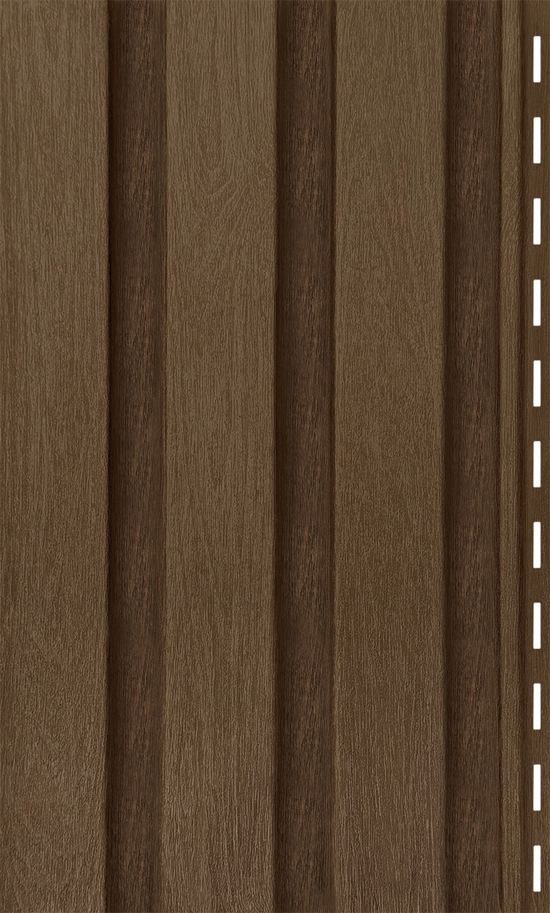 Сайдинг Timberblock Рейка фасадная — это вертикальная панель, стилизованная под три узкие деревянные рейки с чёткими гранями. Фактура точно передаёт природный рисунок дерева, а строгая геометрия придаёт фасаду выразительность и современный стиль.